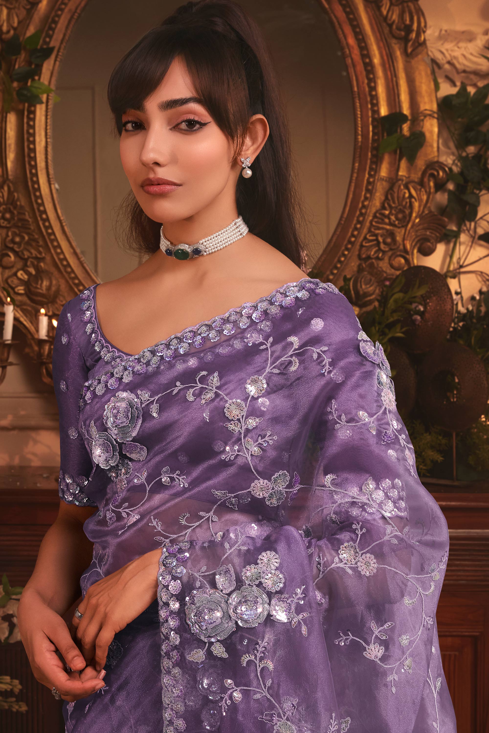Organza Fabric Lavender Color Excellent Saree With Border Work