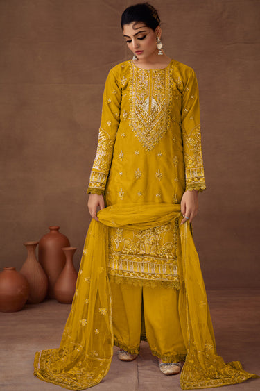 Organza Fabric Mustard Color Festive Wear Embroidered Palazzo Salwar Kameez