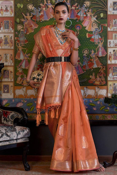 Organza Fabric Orange Color Amazing Handloom Weaving Saree