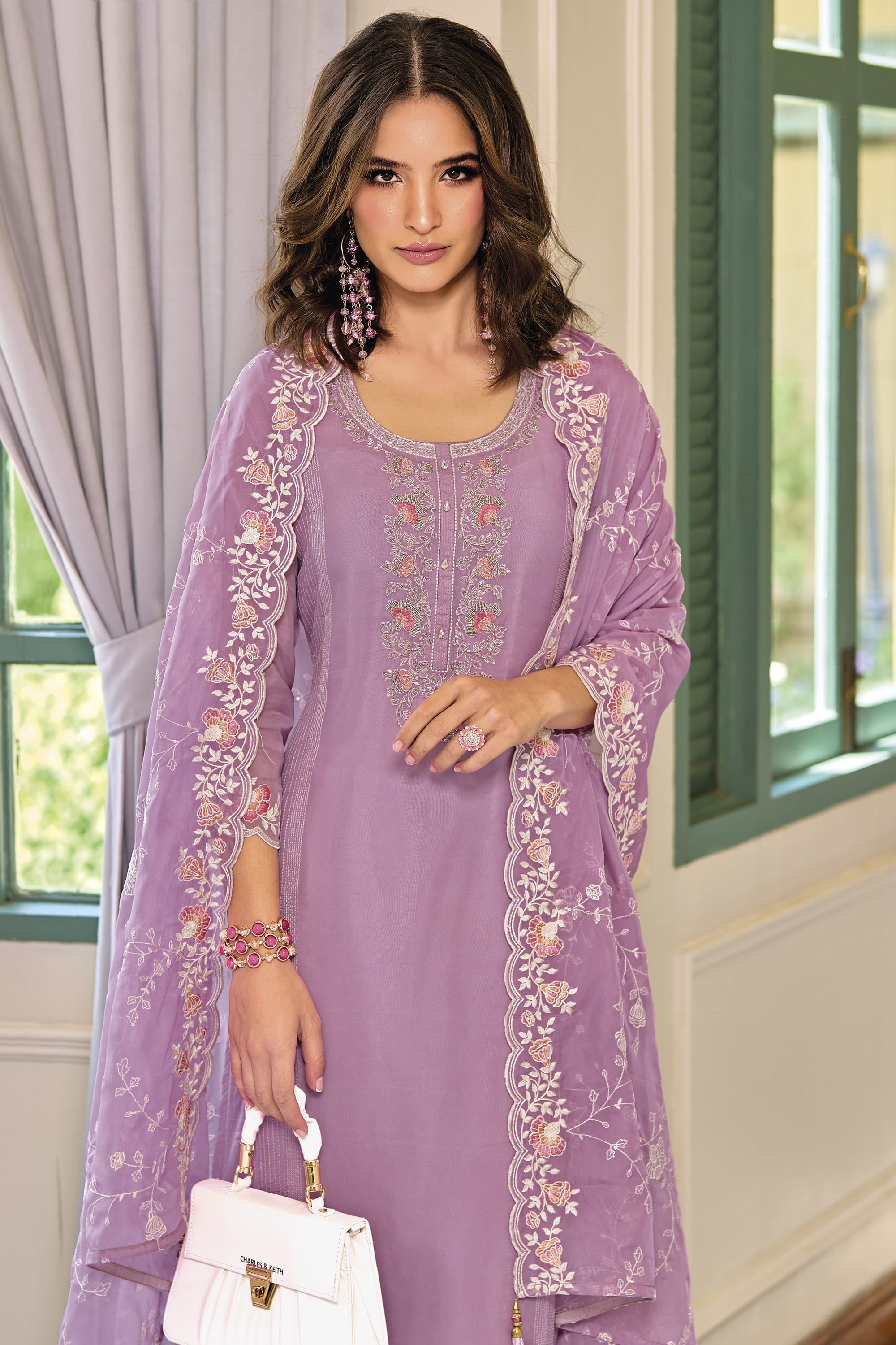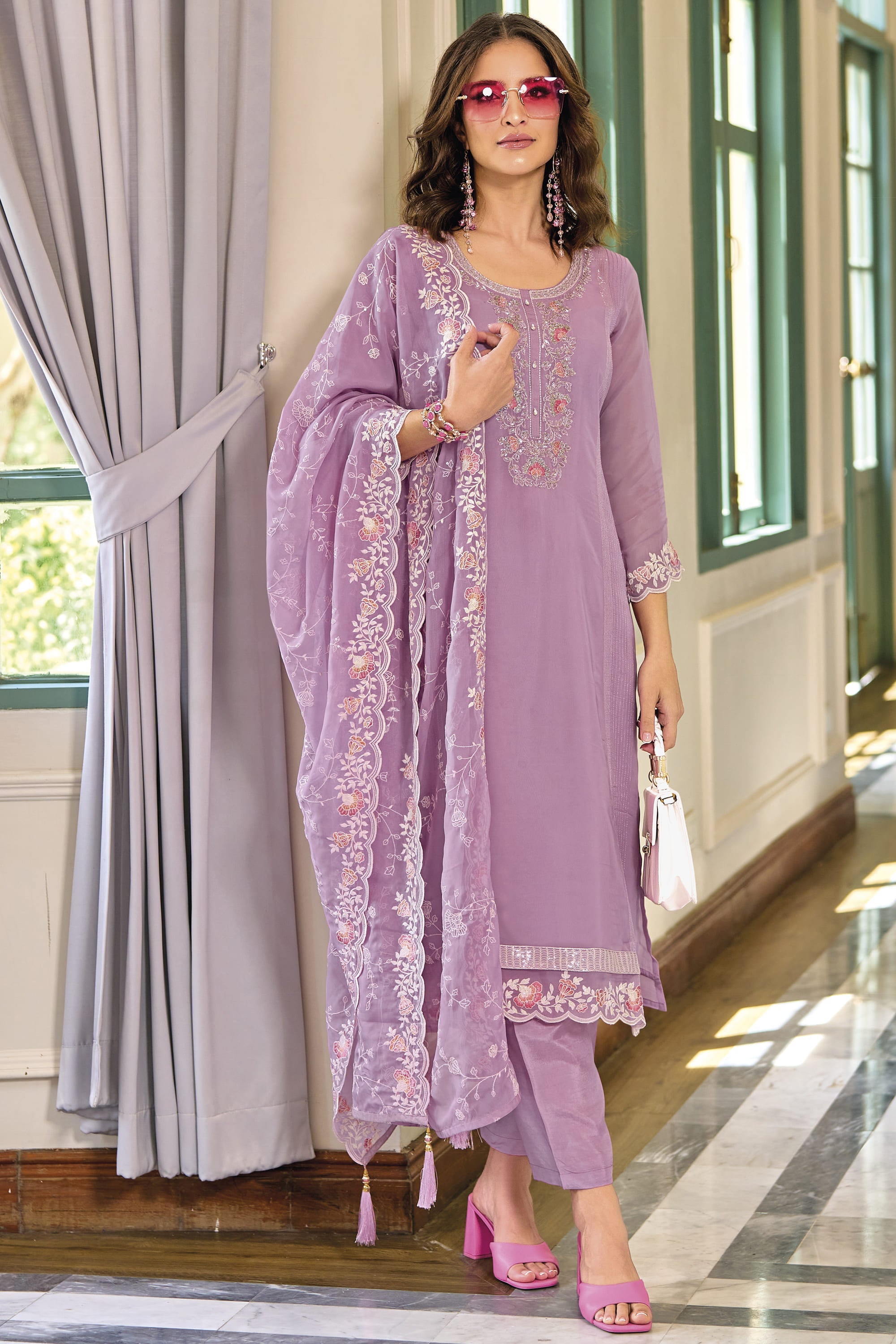 Elevate your ethnic wardrobe with this beautiful embroidered organza salwar suit. The stunning embroidery on the kurta and dupatta adds an elegant touch to the outfit, making it perfect for any formal occasion. The suit includes a flared kurta with a round neck and full sleeves, a matching salwar, and a dupatta. Available in a range of sizes, this readymade salwar suit will make you look and feel confident. Get yours today and step out in style!
