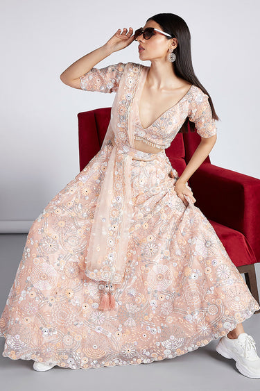 Organza Wedding Wear Chaniya Choli In Peach With Sequins Work And Designer Blouse