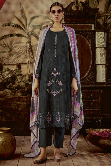 Parsi Embroidered Art Silk Fabric Long Straight Cut Suit In Black Color