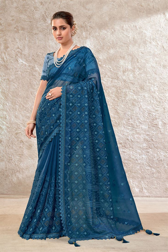 Party Style Organza Fabric Blue Color Supreme Saree