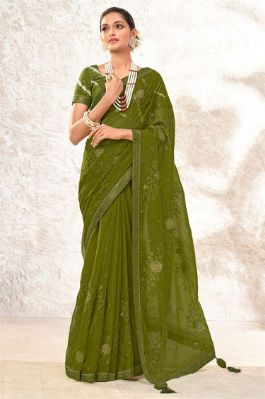 Party Style Organza Fabric Olive Color Coveted Saree