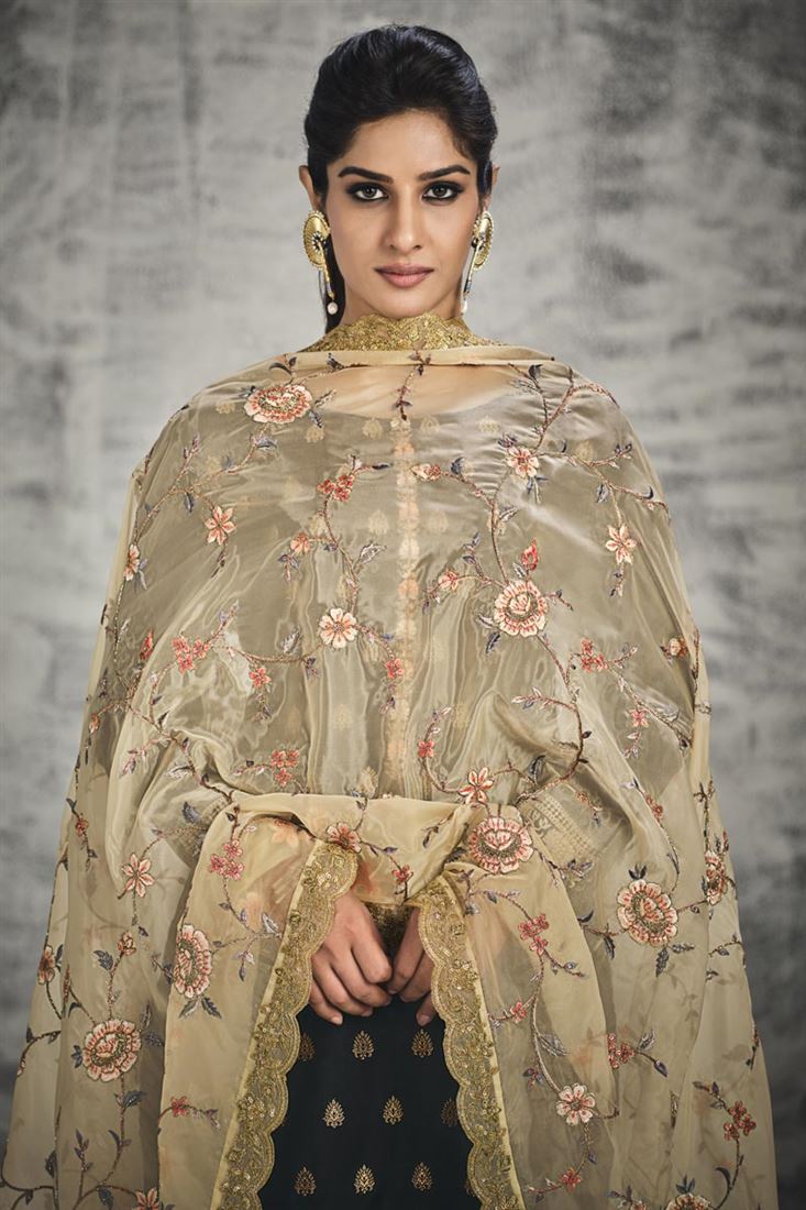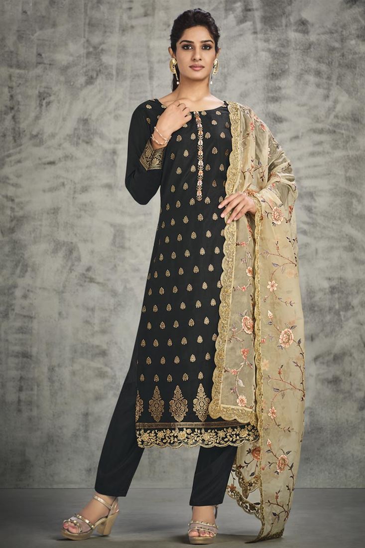 Party Wear Black Color Embellished Jacquard Silk Salwar Suit