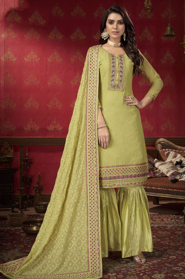 Party Wear Embroidered Work Yellow Color Sharara Suit In Georgette Fabric