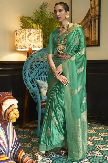 Party Wear Satin Fabric Green Color Trendy Saree