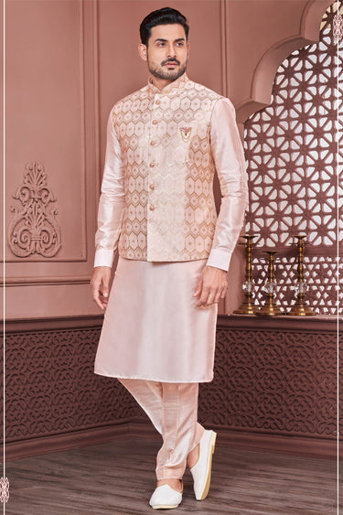 Peach Color Banarasi Silk Fabric Embroidery Work Sangeet Readymade Men Kurta Pyjama With Jacket