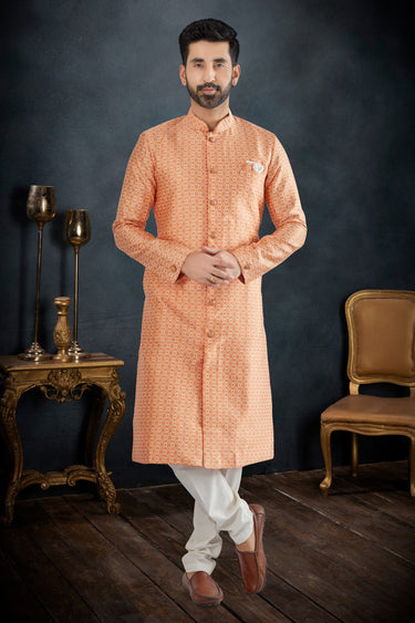 Peach Color Wedding Wear Banarasi Jacquard Fabric Designer Readymade Indo Western Suit For Men