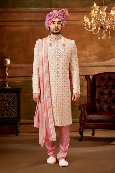 Peach Gorgeous Georgette Fabric Wedding Wear Readymade Heavy Embroidered Groom Sherwani For Men With Stole
