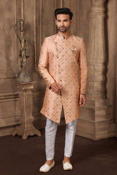 Peach Jacquard Silk Sangeet Wear Readymade Indo Western For Men