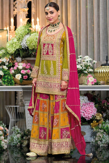 Step into elegance with our Readymade Chinon Sharara Suit, designed to make every occasion special. The top, bottom, and dupatta are crafted from luxurious Chinon fabric, promising a flowing and graceful silhouette. Featuring intricate embroidery work, this ensemble adds a touch of regal charm to your look. Whether you're attending a festive celebration or a grand gathering, this Sharara suit ensures you radiate timeless sophistication. Please note that slight color variations may occur due to digital imaging, and the accessories shown are for styling inspiration only. Elevate your ethnic wardrobe with effortless elegance!
