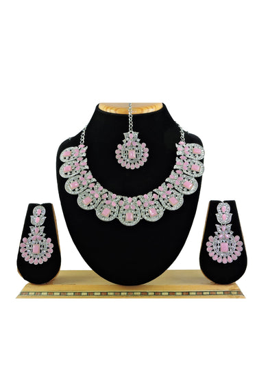 Pink Color Alloy Material Function Wear Fashionable Necklace Set With Earrings And Mang Tikka