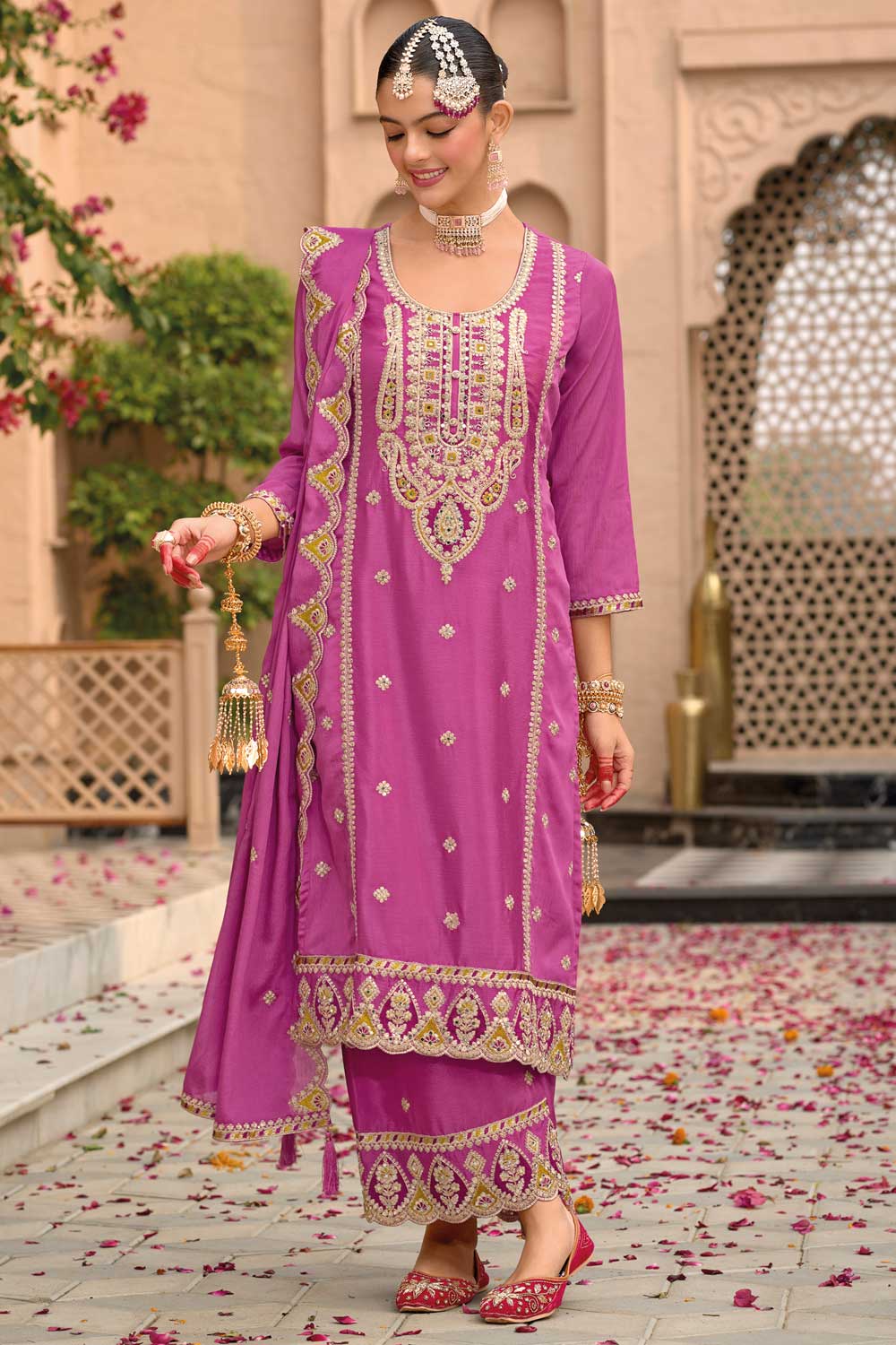 Elevate your ethnic style with this Readymade Palazzo Suit, a masterpiece crafted from Heavy Chinon fabric. The luxurious texture and intricate embroidery work make it a stunning choice for festive occasions, functions, and Eid celebrations. Top Details: Heavy Chinon with exquisite embroidery, 42-inch length for a graceful look. Bottom Details: Heavy Chinon Palazzo for unmatched comfort and elegance. Dupatta: Coordinating Heavy Chinon dupatta with delicate details, completing the ensemble with charm. This outfit effortlessly blends traditional craftsmanship with contemporary sophistication, ensuring you stand out in every celebration. Please note: Slight color variations may occur due to digital photography. Turn heads with this timeless creation, designed to make every occasion memorable!