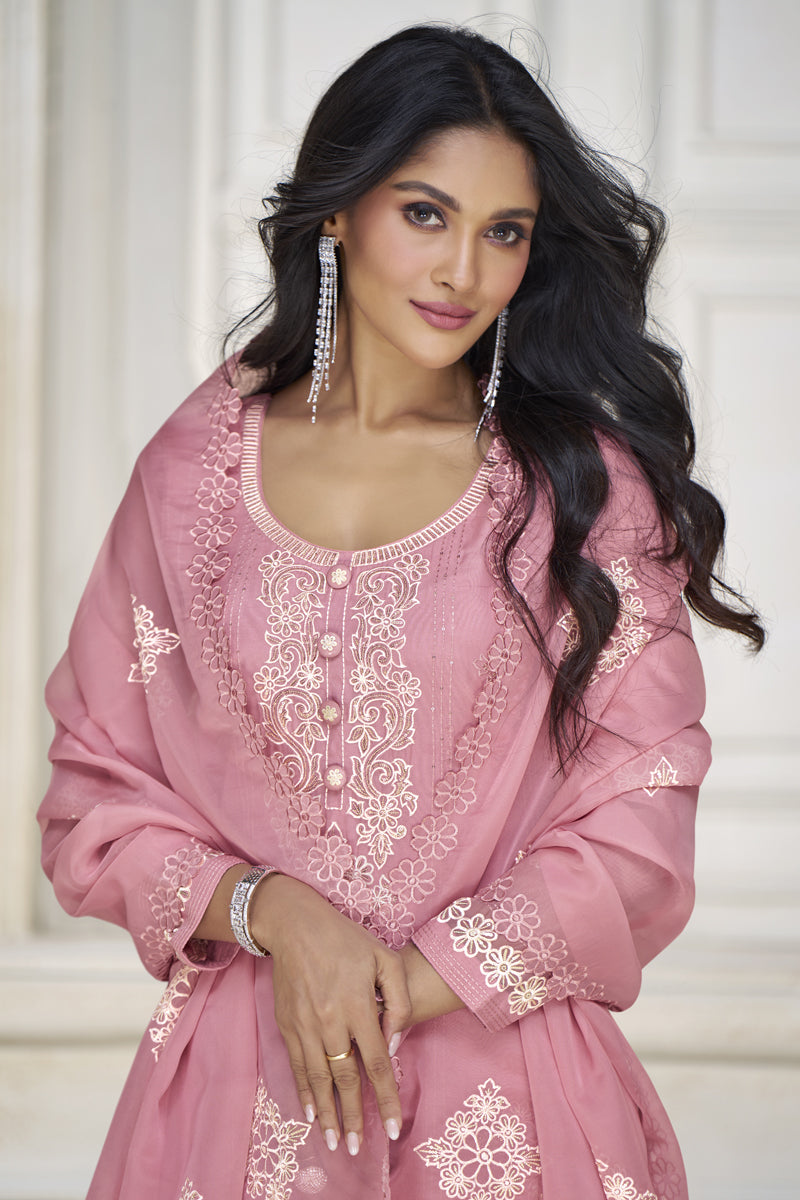 Pink Color Function Wear Embroidered Designer Long Straight Cut Suit In Organza Silk Fabric