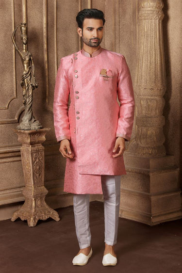 Pink Color Jacquard Silk Sangeet Wear Readymade Indo Western For Men