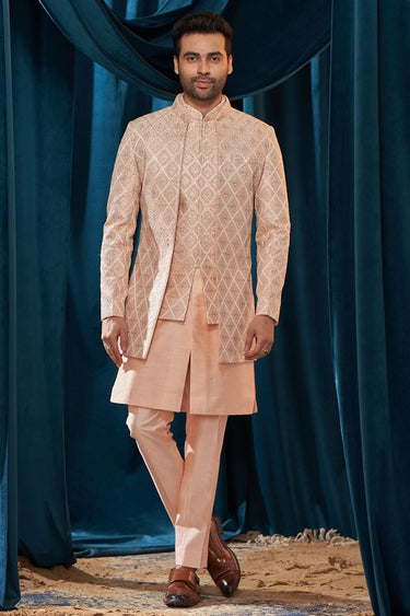 Pink Color Silk Fabric Heavy Embroidered Wedding Wear Designer Readymade Indo Western For Men