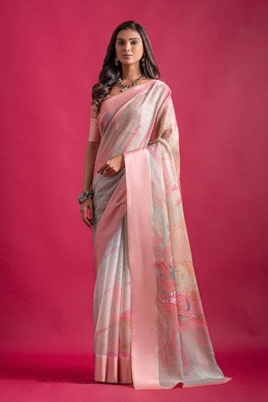 Pink Printed Pure Linen Checks Saree