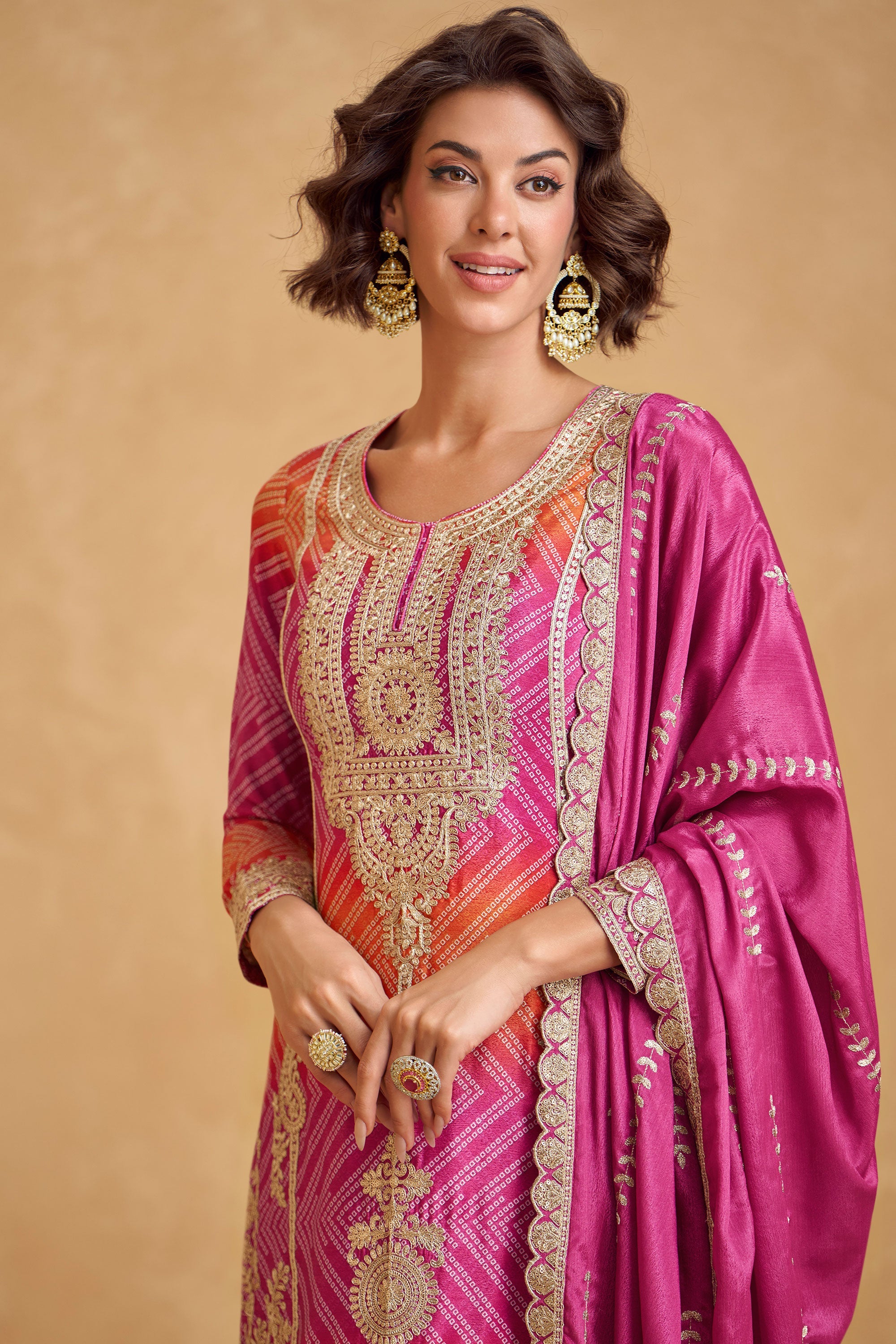 Experience timeless elegance with the Chinon Silk Embroidered Readymade Sharara Style Salwar Kameez. The smooth texture of chinon silk combined with fine embroidery gives this outfit a refined and polished appearance. Its sharara design offers unmatched comfort, making it perfect for long celebrations or formal gatherings. This pre-stitched salwar kameez allows for easy wear without any additional tailoring, saving your time. From vibrant festivities to formal functions, this outfit will have you looking graceful and radiant. Complete your ensemble with matching bangles and footwear to create a standout look. A beautiful blend of style and practicality for every woman.