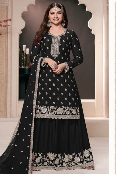 Prachi Desai Chinon Fabric Embroidered Palazzo Salwar Kameez In Black Color