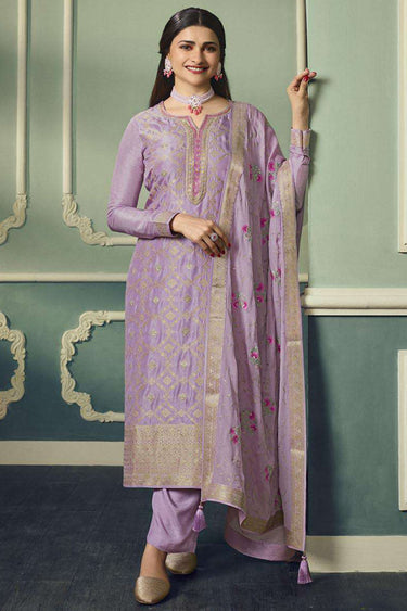 Prachi Desai Lavender Color Function Wear Embroidered Designer Long Straight Cut Suit In Viscose Jacquard Fabric