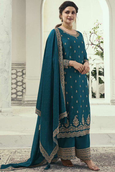 Prachi Desai Teal Color Georgette Silk Function Wear Awesome Palazzo Suit