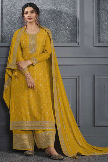 Prachi Desai Yellow Color Glorious Jacquard Silk Palazzo Suit