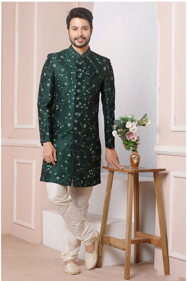 Pretty Dark Green Color Banarasi Silk Fabric Wedding Wear Groom Sherwani For Men