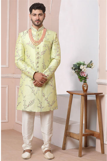 Pretty Light Yellow Color Banarasi Silk Fabric Wedding Wear Groom Sherwani For Men