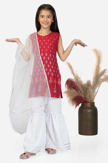 Pamper your young ones with this premium quality, readymade Kids Kurti With Palazzo Style Bottom. This set is beautifully designed with eye-catching prints on pure cotton fabric. Aesthetic meets comfort in this stunning Indian traditional wear set that pairs a stylish kurti with an exquisite sharara. Guaranteed delivery within 3-6 working days upon order.