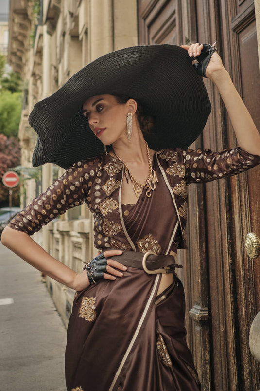 Pure Satin Silk Fabric Brown Color Handloom Zari Weaving Work Festive Wear Trendy Saree