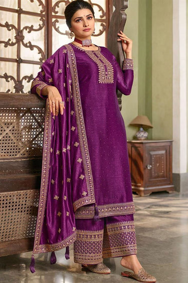 Purple Color Georgette Fabric Function Wear Embroidered Work Chic Palazzo Suit Featuring Prachi Desai