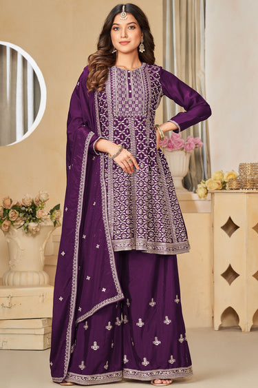 Purple Color Gorgeous Embroidered Chinon Fabric Palazzo Suit