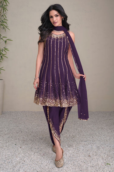 Purple Silk Sequins Work Readymade Short Top With Dhoti Style Patiala Salwar Set