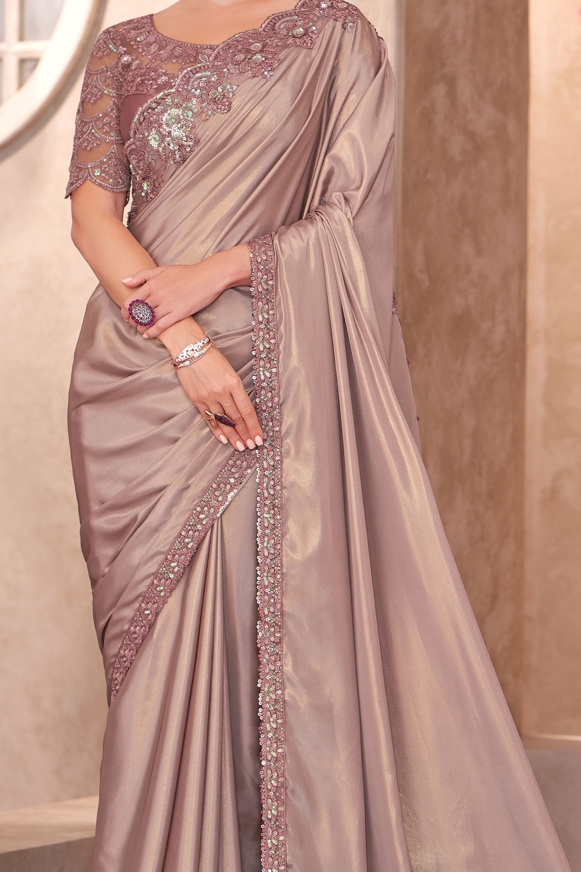 Radiant Border Work On Beige Color Crepe Silk Fabric Saree