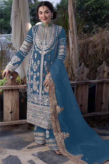 Radiant Cyan Color Georgette Fabric Pakistani Replica Palazzo Suit