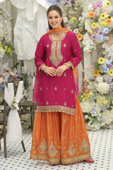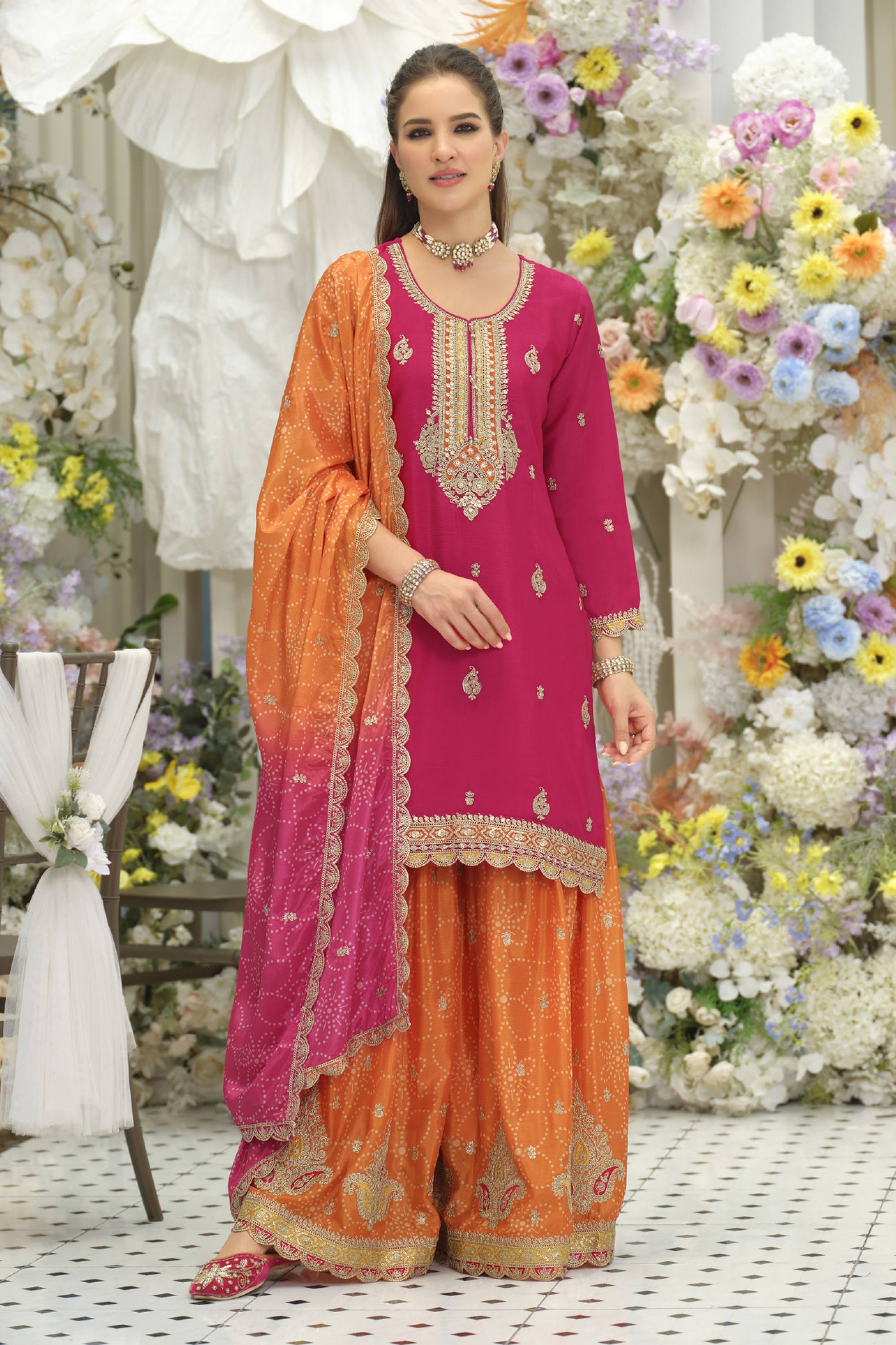 Add a touch of elegance to your festive wardrobe with this beautifully designed Salwar Kameez Palazzo Suit. Made from luxurious Chinon fabric, this readymade outfit offers a soft feel and graceful drape for effortless comfort. Due to digital photography, slight color variations may occur.
