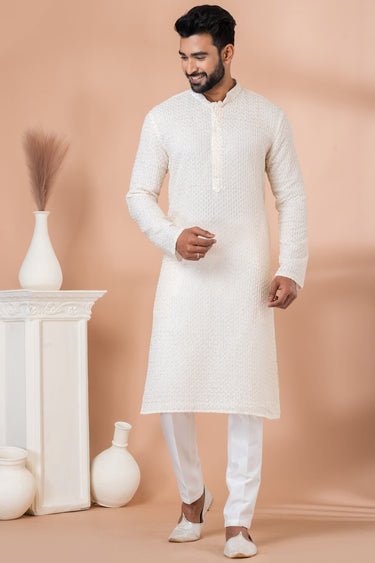 Reception Wear Attractive Sequins Embroidery Readymade Men Kurta Pyjama In White Color