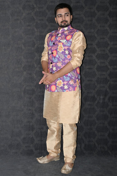Reception Wear Readymade Art Silk Fabric Beautiful Kurta Pyjama For Men With Purple Color 3 Pcs Jacket Set