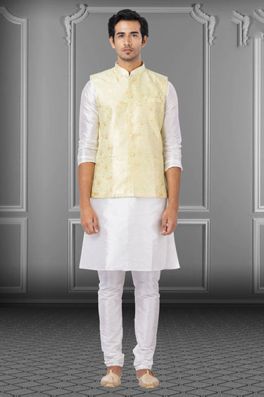 Reception Wear White Dhupion Raw Silk Fabric Attractive Readymade Kurta Pyjama For Men With Jacket