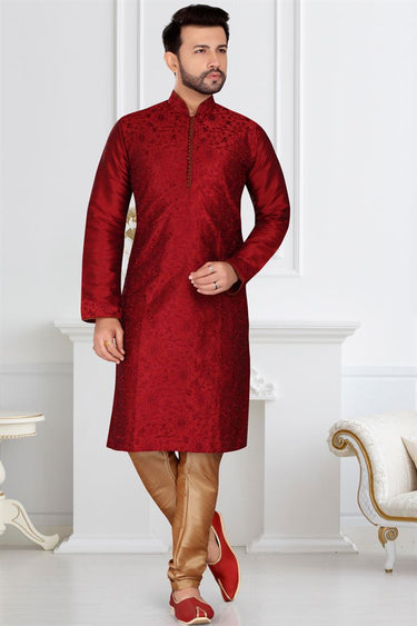 Red Color Silk Fabric Reception Wear Readymade Trendy Mens Kurta Pyjama