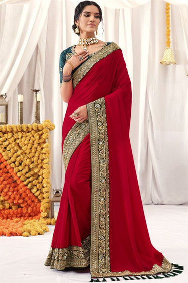 Red Color Vichitra Silk Lovely Lace Border Work Saree