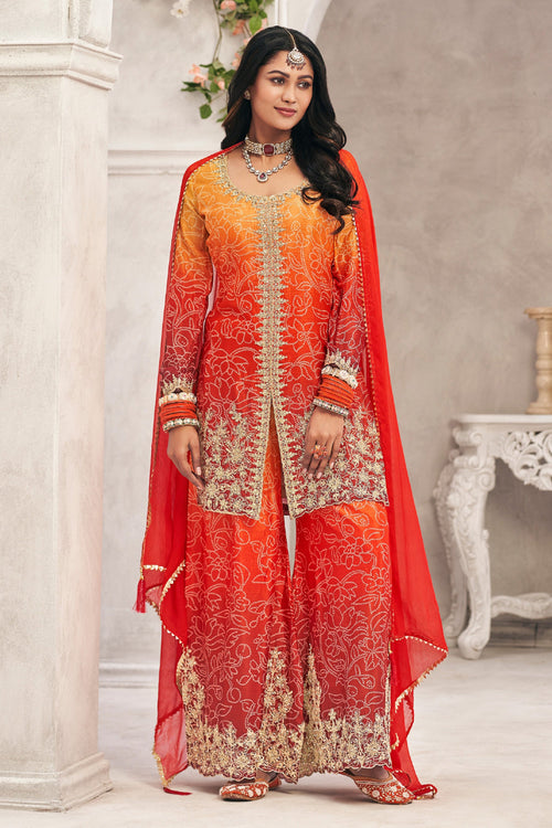 Red Embroidered Chinon Readymade Palazzo Style Suit
