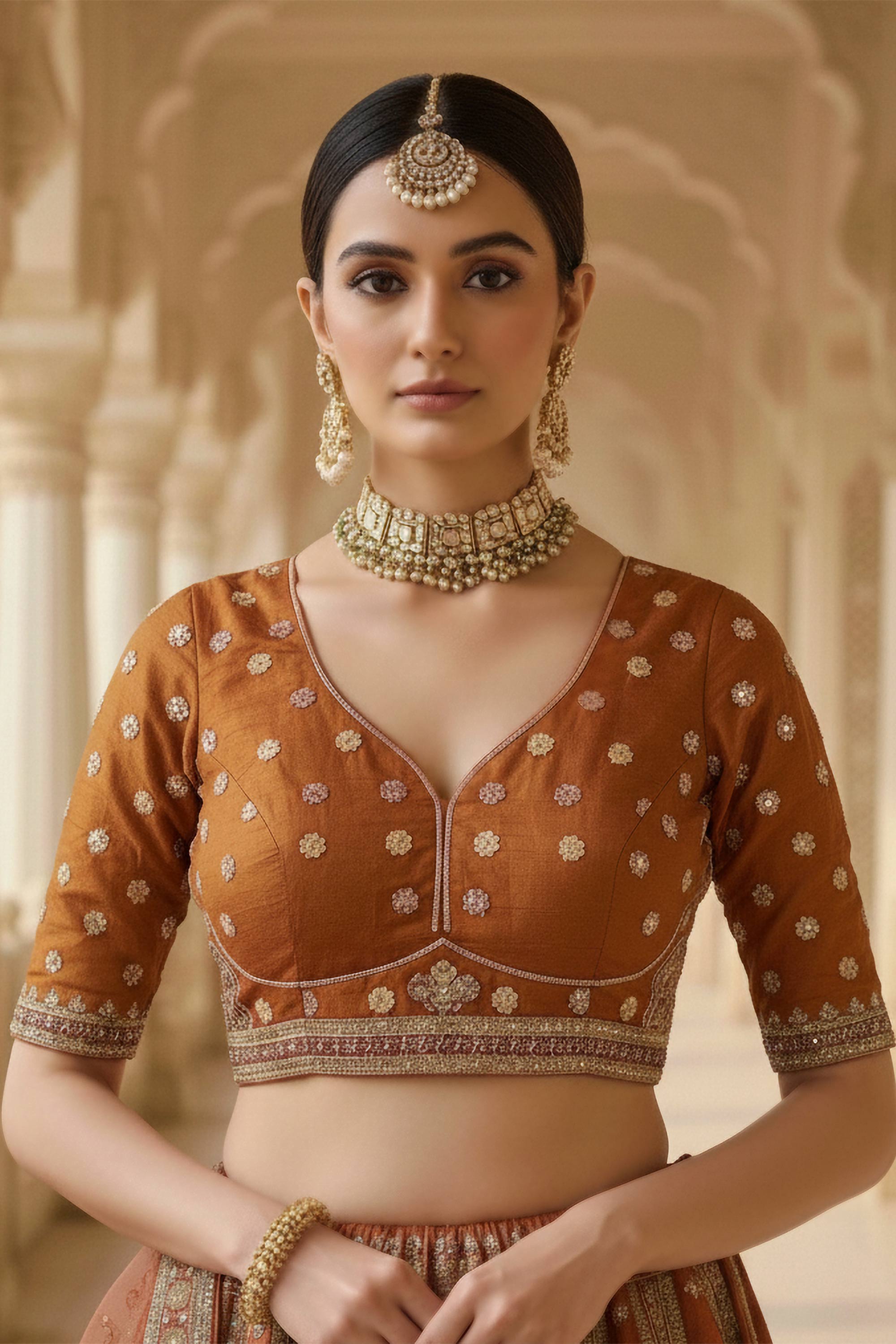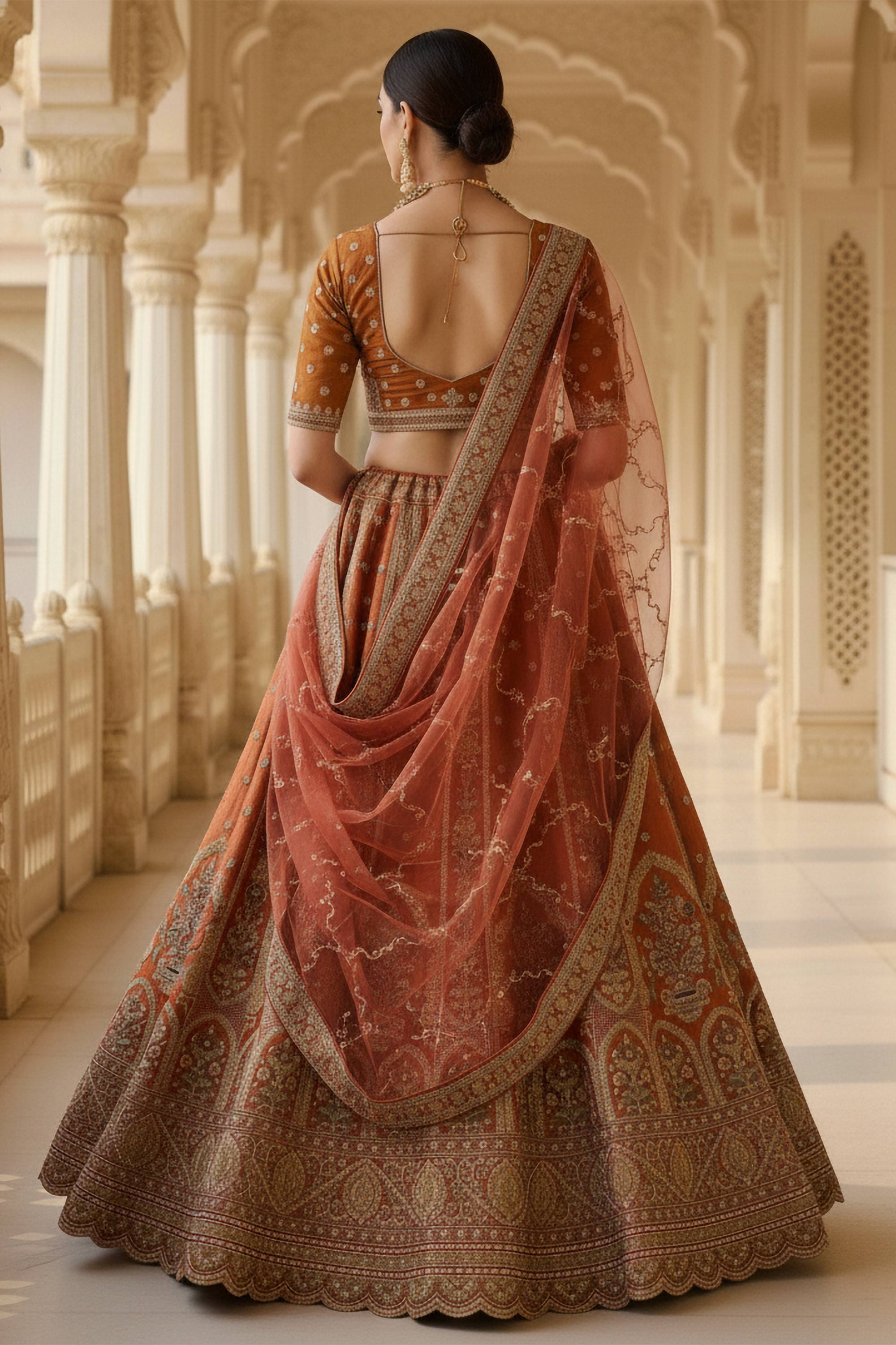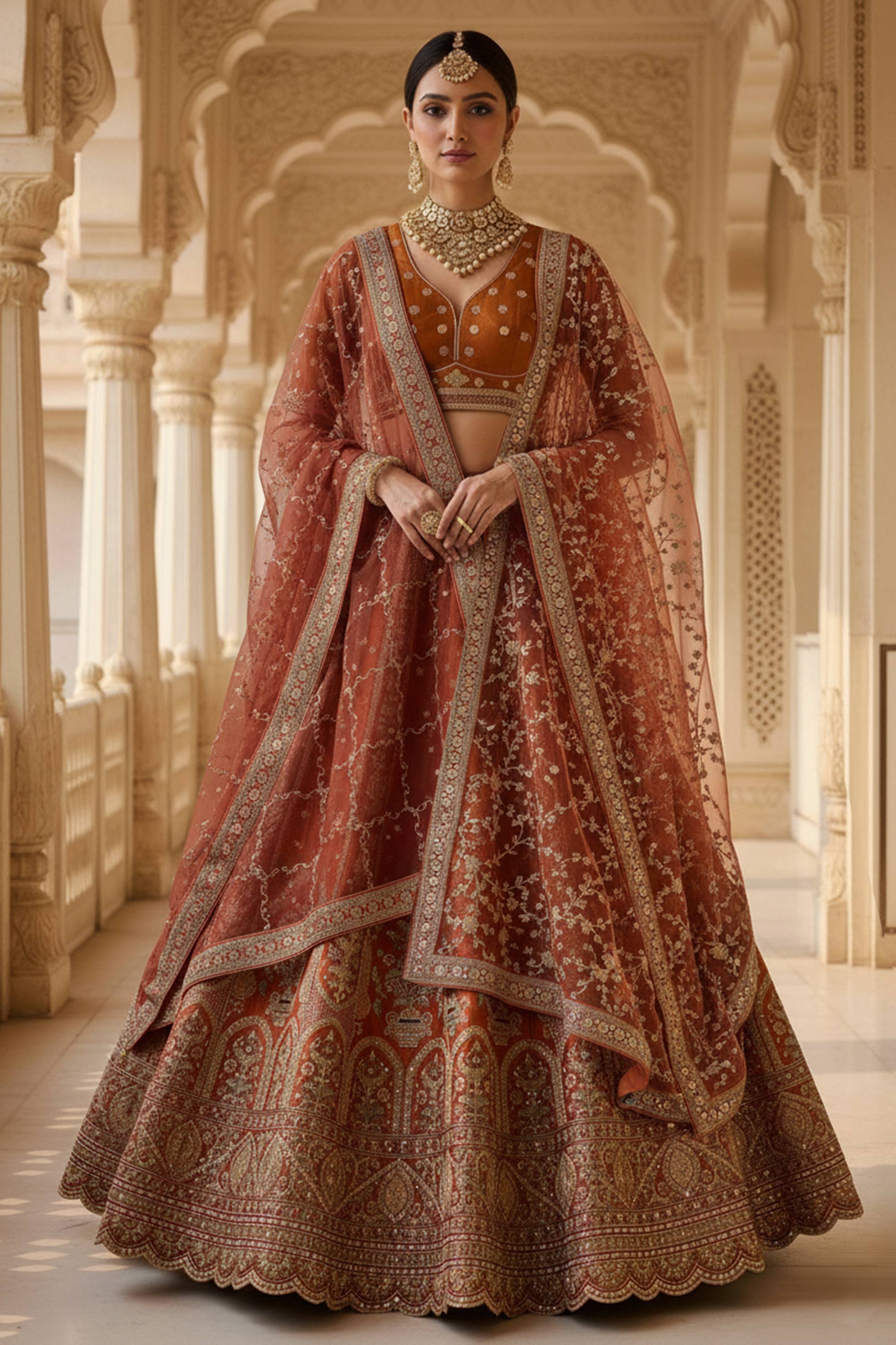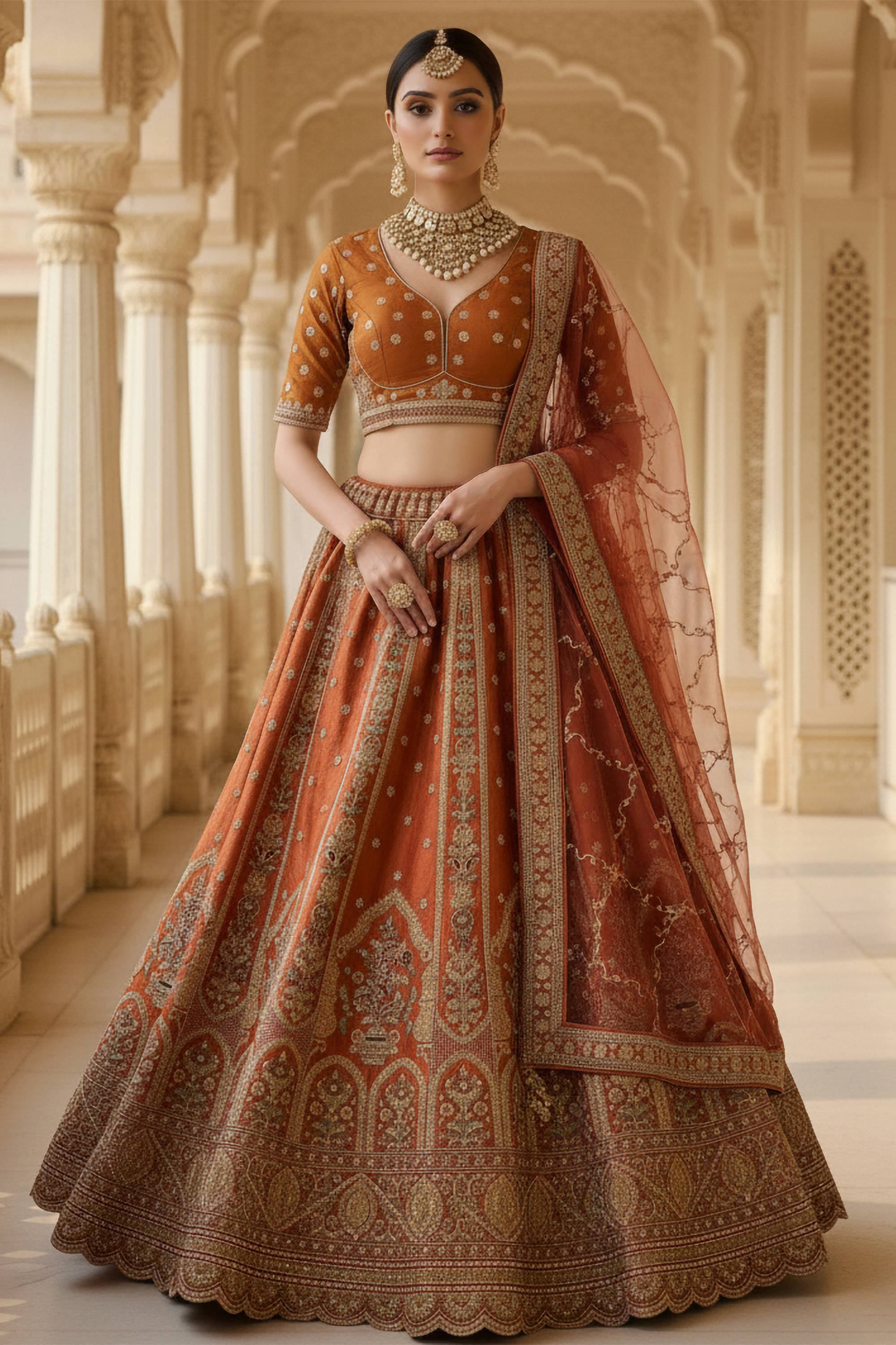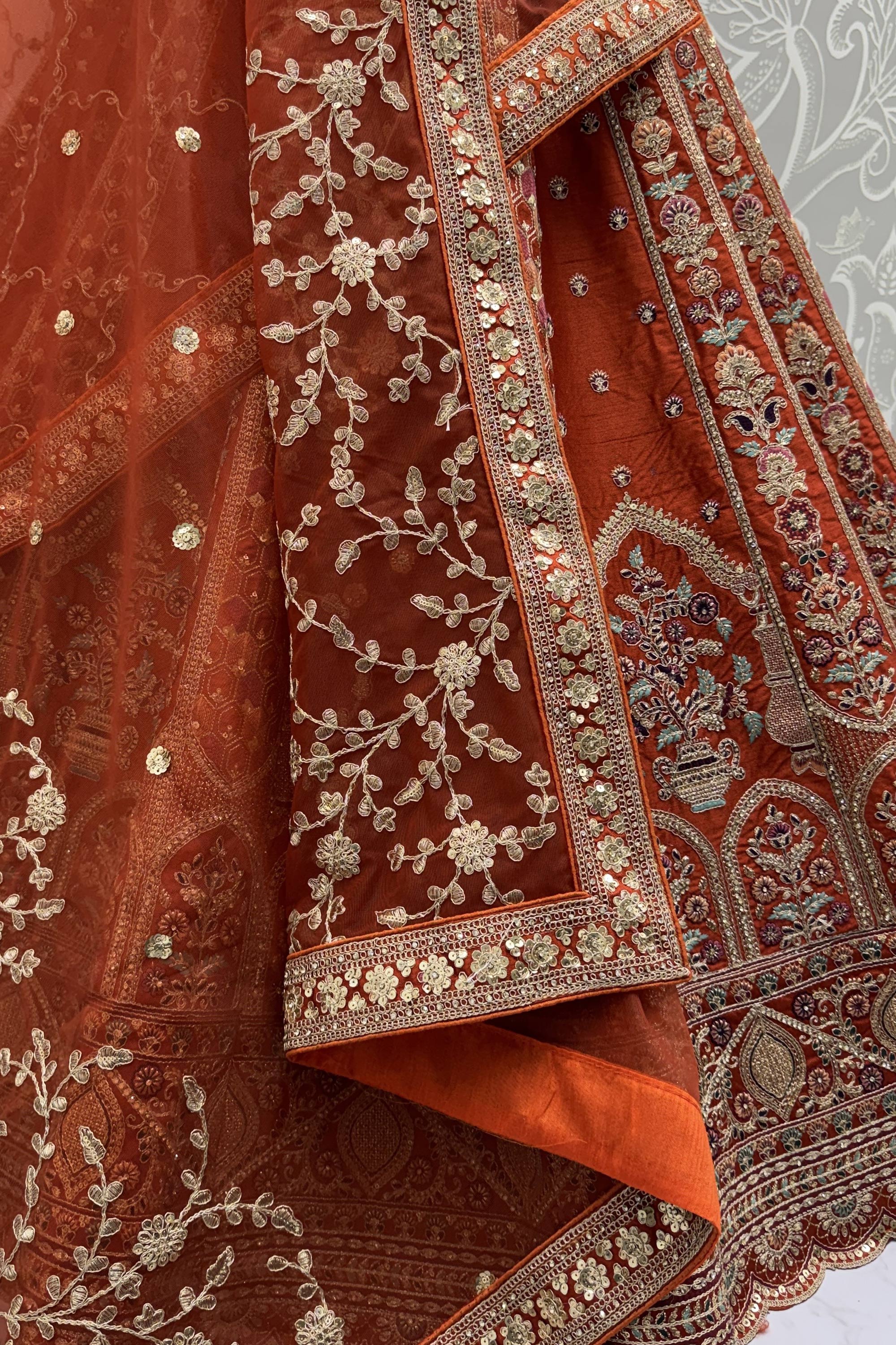 Rust Charm Bridal Embroidered Lehenga Choli