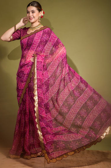 Get ready to shine with this saree. Made from premium quality georgette chiffon fabric, this saree is perfect for any casual or festive occasion. The bandhani print with foil work creates a stunning visual effect, making this saree a must have in your collection