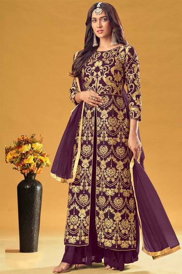 Sangeet Wear Georgette Fabric Wine Color Splendid Palazzo Suit With Embroidered Work