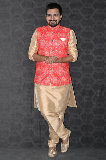 Sangeet Wear Readymade Lovely Art Silk Fabric Kurta Pyjama For Men With Red Color 3 Pcs Jacket Set
