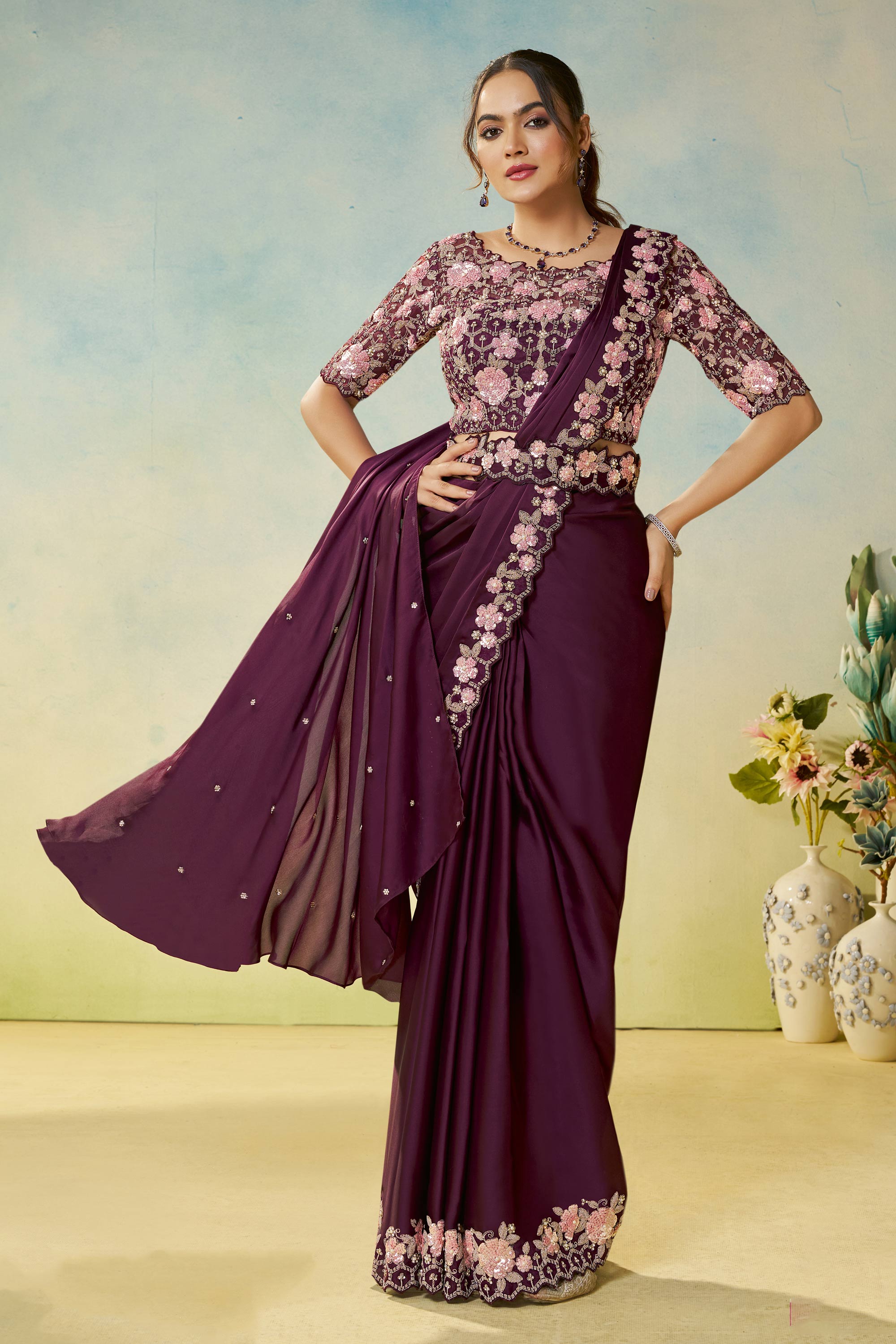 Satin Silk Border Work Wine Readymade Saree For Wedding Wear
