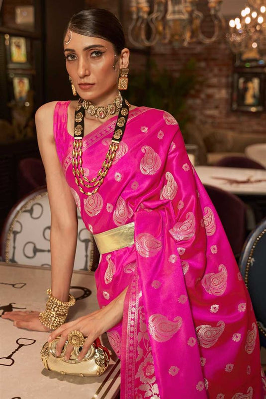 Satin Silk Fabric Rani Color Weaving Work Soothing Saree