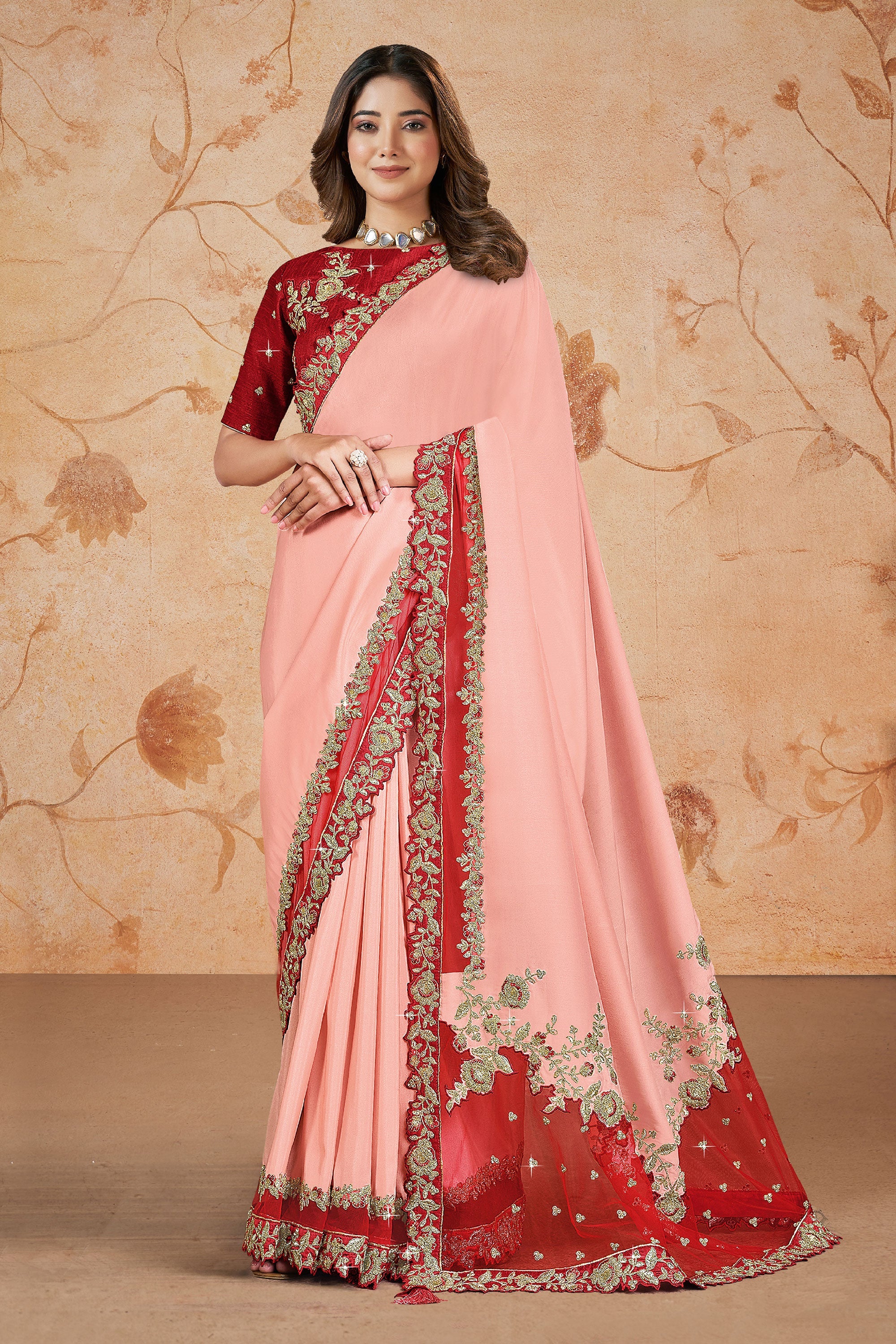 Satin Silk Georgette Embroidered Border Work Saree In Peach Color